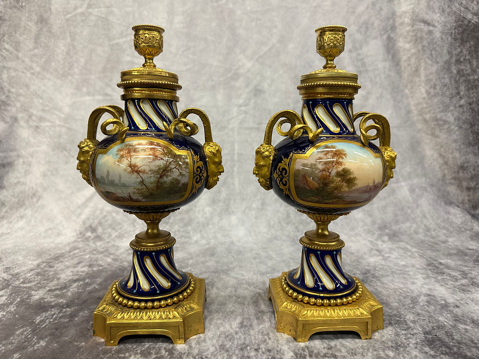 French Serves-Style Porcelain & Gilt Bronze Cassolettes Urns